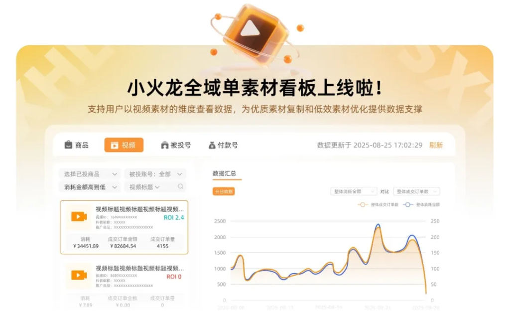 客户场景 :投放全域计划时,用户无法自主筛选具体视频素材,更难追踪单个视频的消耗情况,导致素材优化缺乏无方向。