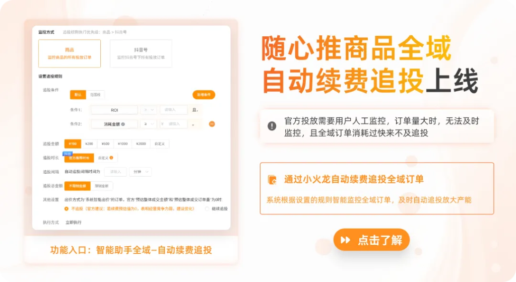 功能价值 :系统基于预设规则智能监控订单消耗,自动触发追投动作,无需人工时刻盯守,精准抓住投放窗口期,让产能放大更及时、更高效。
